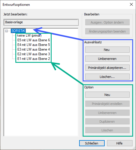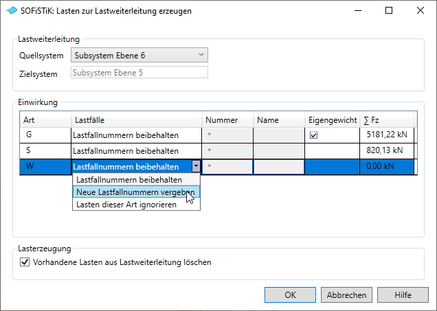 Alle Bezeichnungen können frei benannt werden sollten jedoch einen Zusammenhang zur Verwendung aufzeigen um eine Übersichtlichkeit zu bewahren. In diesem Dialog ist zunächst ein neuer Auswahlsatz zu erstellen SOFiSTiK. Darunter entstehen dann die benötigten Optionen. Primär sollte keine Lastweiterleitung vereinbart sein keine LW (primär). Danach folgenden als Option die gewünschten LW E5 mit LW aus E6. Auch hier sollten die Bezeichnungen sprechend gewählt werden.