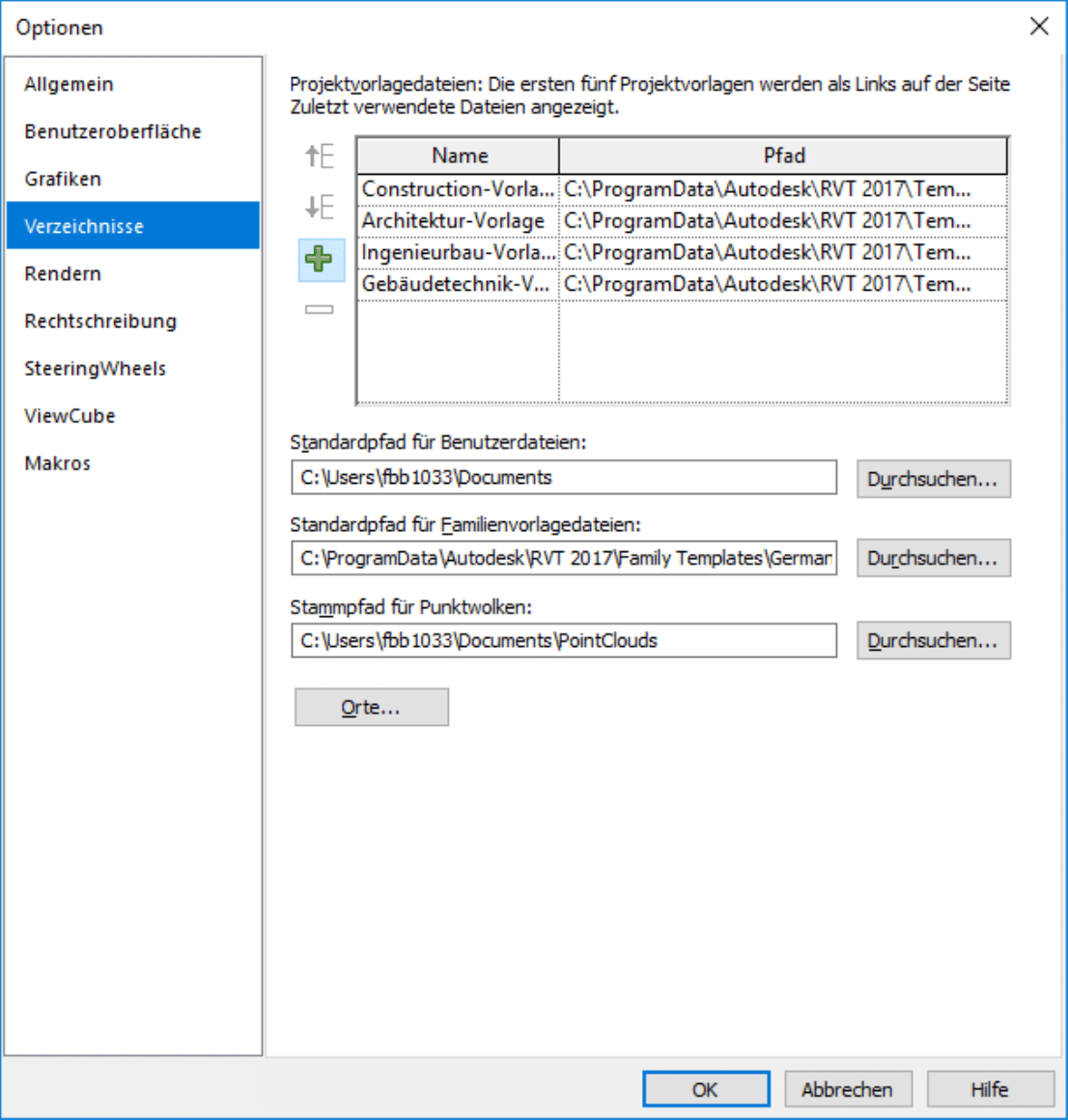 Nach der Installation der SOFiSTiK BiMTOOLS Library wird ein auf SOFiSTiK abgestimmtes Template zur Verfügung gestellt. Dieses kann den Favoriten von Revit hinzugefügt werden. Hierzu navigiert man über die Revitschaltfläche zu den Revitoptionen. In der Kategorie Verzeichnisse kann dann das Template _SOF_BiMTOOLS Template 2017_DE_1.0.rte aus dem Installationspfad hinzugefügt werden. Die Vorlage kann dann beim anlegen eines neuen Projektes ausgewählt werden.