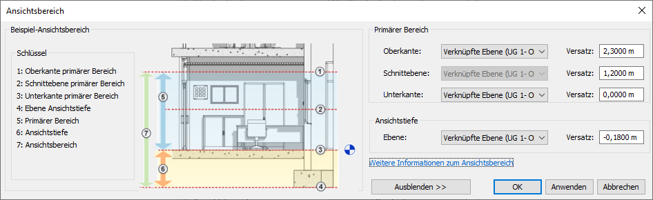 Ist der Planbereich aktiviert kann im Eigenschaftendialog die Schnittebenenlage konfiguriert werden