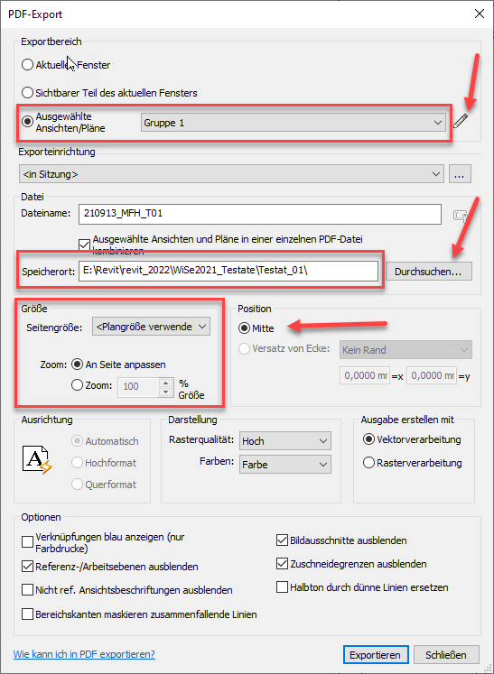 Für die Seitengröße sollte Plangröße verwenden gewählt werden. Beim Zoomfaktor ist in diesem Fall 100% zu setzen da sonst der Maßstab nicht korrekt dargestellt wird. Als Position bietet sich Mitte an. Diese Empfehlungen können nach eigenem Ermessen angepasst werden wenn z.B. eine abweichende Seitengröße gewählt wird.
