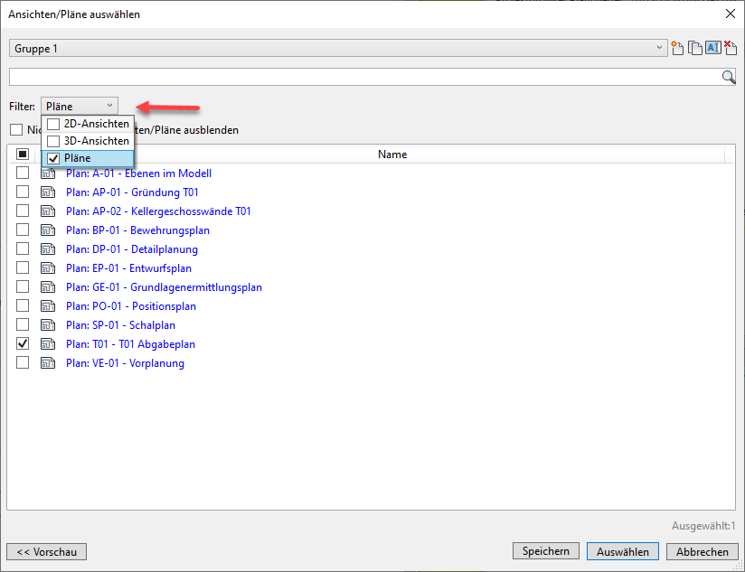 Die Elemente welche als PDF-Datei exportiert werden sollen sind in einem Unterdialog zu wählen. Der Dialog wird über das Bleistift-Symbol erreicht. Im Bereich Filter kann die Anzahl der angezeigten Elemente verringert werden. Die gewünschten Elemente sind auszuwählen und der Dialog per Speichern und Anwenden zu verlassen.