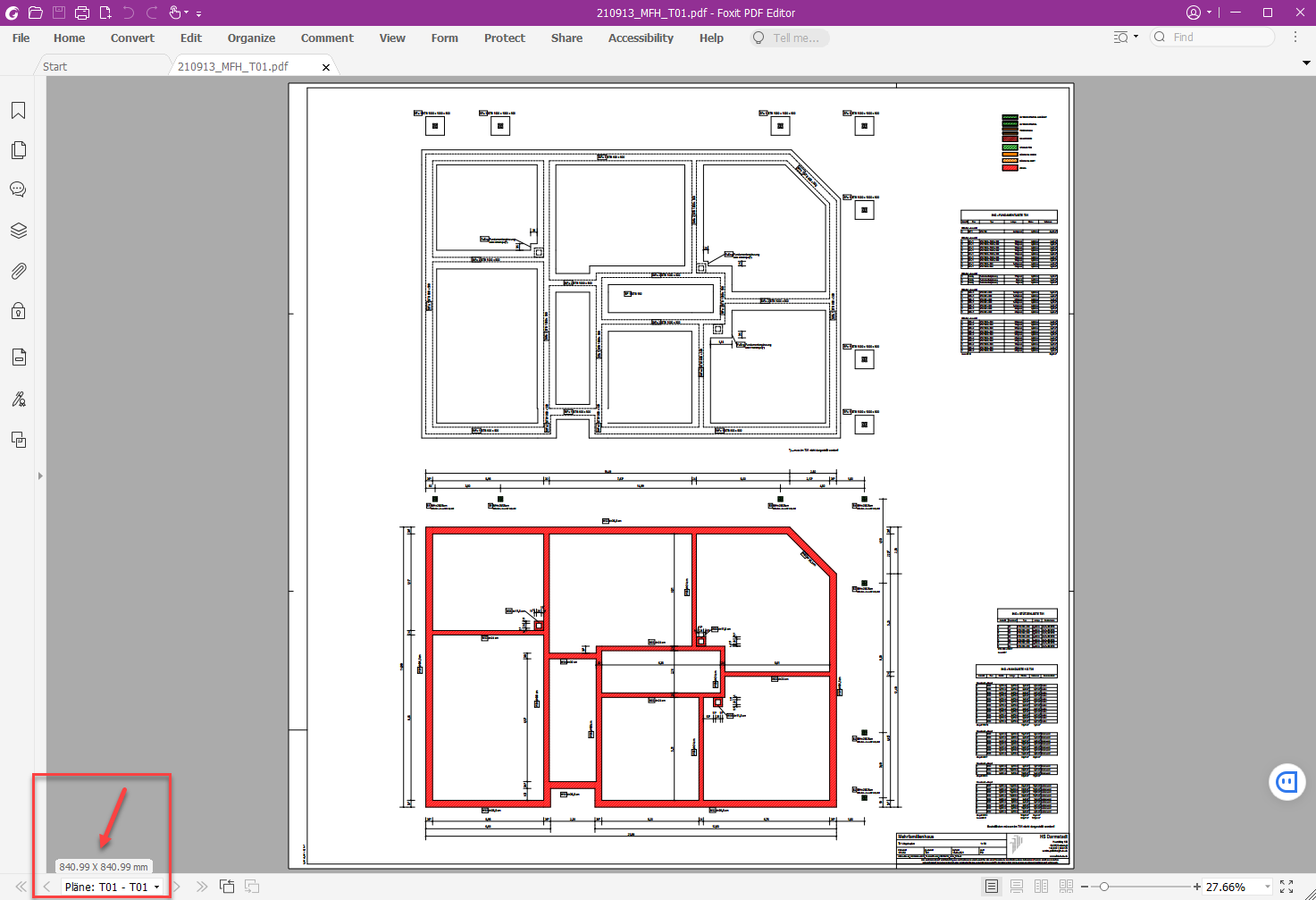 In einem beliebigen PDF-Viewer kann man erkenn dass die Blattgröße korrekt übernommen wurde und somit der Plan auch im korrekten Maßstab erzeugt wird.